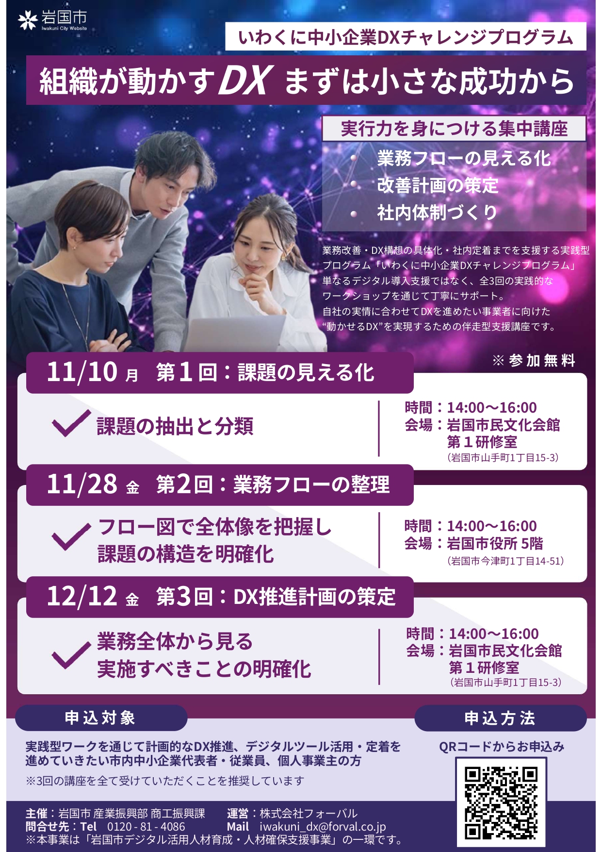 岩国市では自社のDX化を進めていきたい事業者の皆様を対象に、実践的なワークショップ「いわくに中小企業DXチャレンジプログラム」を開催します。「何から始めればいいかわからない」「うちの会社でもできるの?」といった不安を抱える方でも安心して取り組めるよう、専門講師が基礎から丁寧に解説し、課題の整理からDXの推進計画づくりまで一緒に進めていきます。