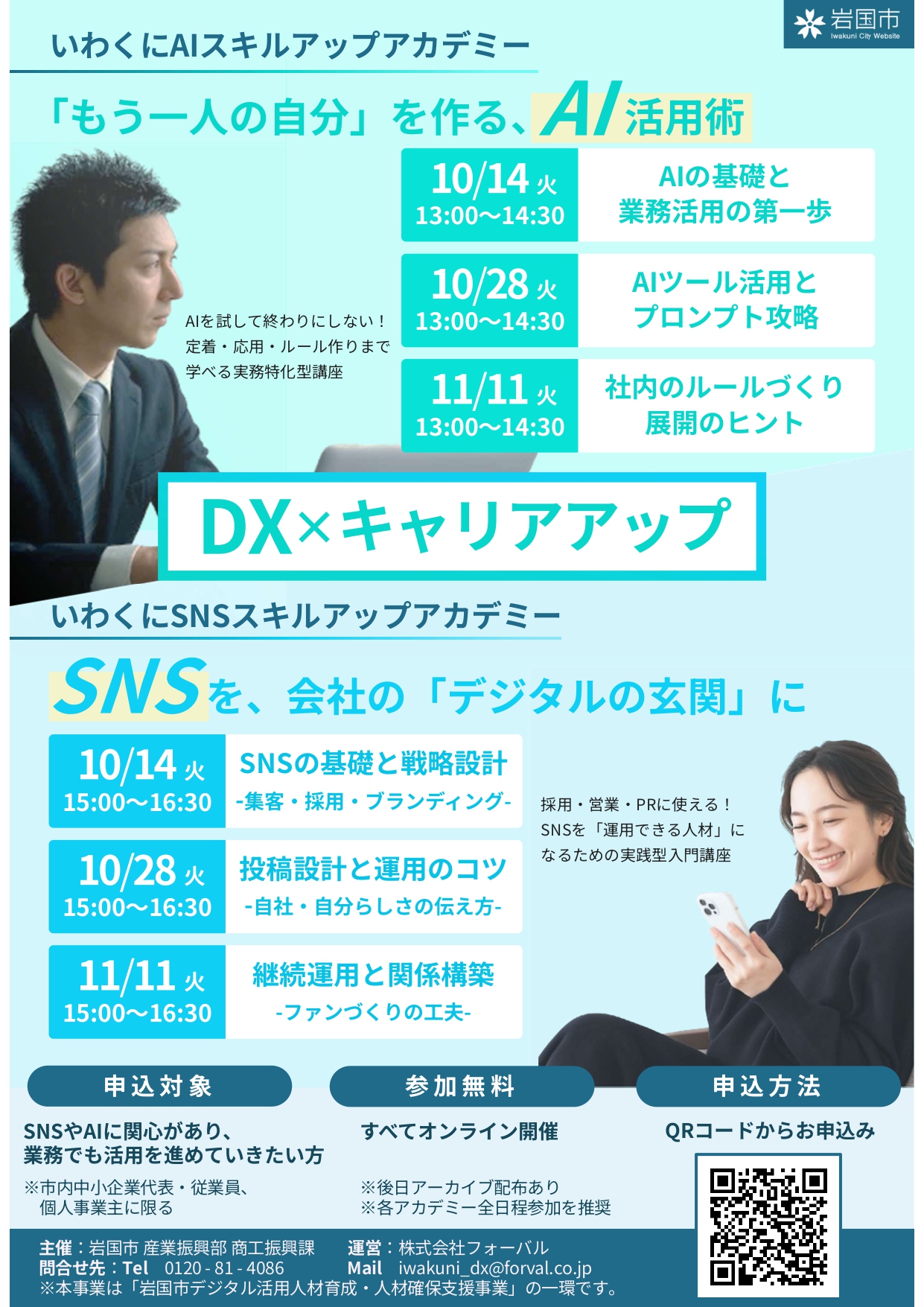 さらに、オンラインでは今注目を集める「AI」や「SNS」を題材としたセミナー「いわくにAI/SNSスキルアップアカデミー」を実施。最新のデジタルツールをどのように活用すれば日々の業務改善や販路拡大につながるのか、具体的な事例を交えて学べます。小さな一歩から始められる実践的な内容なので、すぐに自社で活かせるヒントが満載となっています。